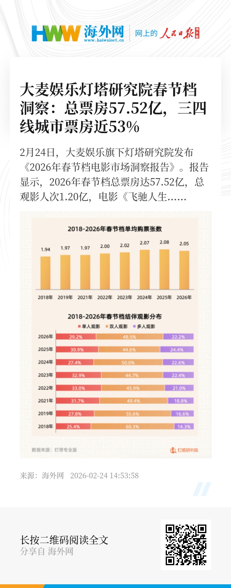 2月24日,大麦娱乐旗下灯塔研究院发布《2026年春节档电影市场洞察报告》。报告显示,2026年春节档总票房达57.52亿,总观影人次1.20亿,电影《飞驰人生3》《惊蛰无声》《镖人:风起大漠》分列档期票房前三名。