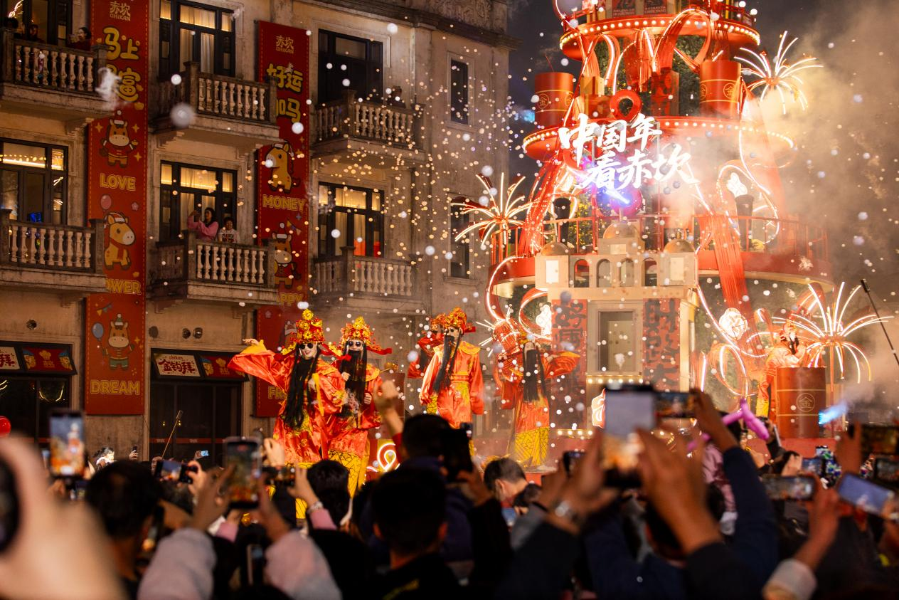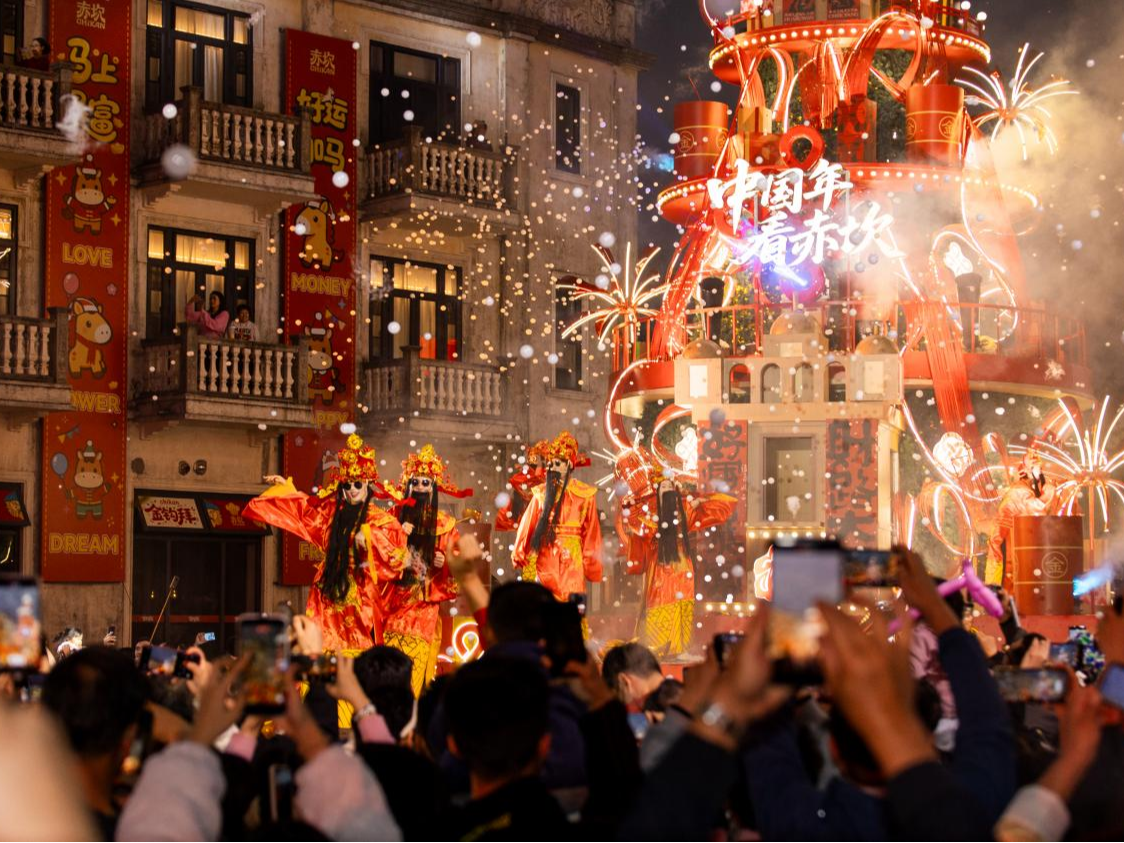 开平碉楼文化旅游区年味十足,累计接待游客同比增长18.42%。“自力有喜市”市集、非遗泮村灯会、民间杂技展演等体验让游客沉浸式感受华侨年魅力。