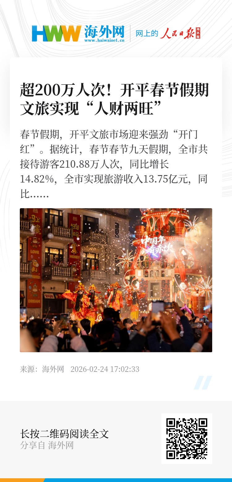 围绕“驰骋侨乡寻年味,畅游开平赏非遗”主题,开平精心推出近90项文旅体活动,旅游人气高涨,核心景区表现尤为抢眼。