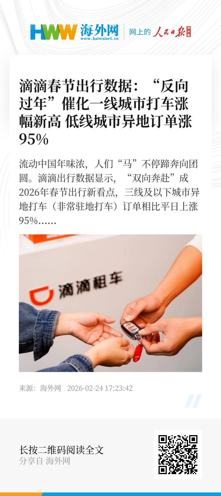 流动中国年味浓,人们“马”不停蹄奔向团圆。滴滴出行数据显示,“双向奔赴”成2026年春节出行新看点,三线及以下城市异地打车(非常驻地打车)订单相比平日上涨95%,“反向过年”带动一线城市打车订单涨幅创新高。“中国年”激发来华旅游热情高涨,假期入境用户的打车订单量同比增长74%。