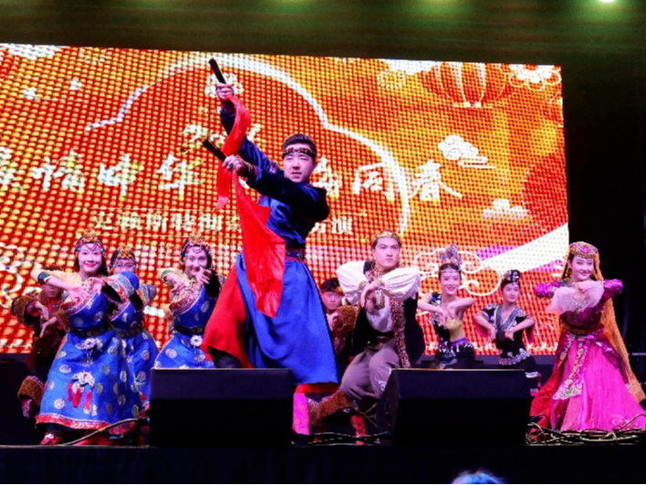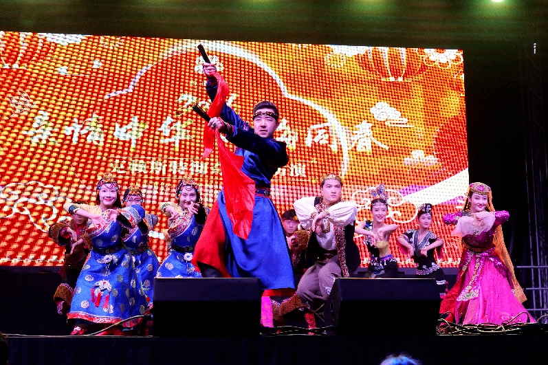 中国煤矿文工团演员以一曲唢呐版《火红的萨日朗》火热开场,高亢嘹亮的乐声瞬间点燃全场,将南半球的夜晚染上家乡的暖色。