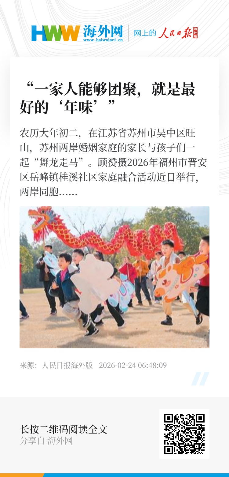 农历大年初二,位于江苏省苏州市吴中区的旺山脚下张灯结彩,热闹非凡。苏州市近百名两岸婚姻家庭成员聚集于此,一起参与舞龙舞狮互动、包饺子等活动,欢度马年新春。在悠扬的手风琴声中,大家一起唱起《爱拼才会赢》《高山青》等耳熟能详的歌曲,将现场气氛推向高潮。