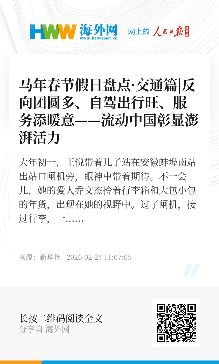 北京针对市内热门景点、商圈以及庙会、游园等重点活动,持续加大运力投入,和属地、公安部门共同做好现场保障;河南郑州组织公交志愿者维持候车秩序、解答换乘咨询、帮扶特殊乘客;江苏与浙江、安徽、山东等周边省份建立省级交界路段同步监测、同步预警、同步调度工作机制,让跨省车流实现有序疏导……各地各部门夜以继日的默默坚守,为流动中国的图景绘上温暖底色。