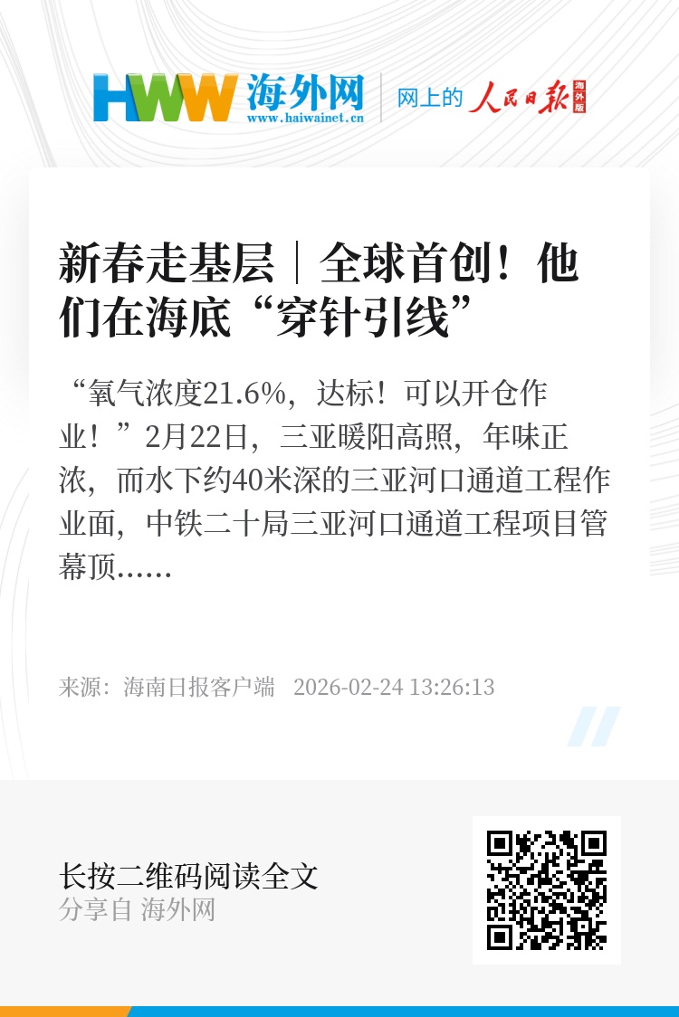 “氧气浓度21.6%,达标!可以开仓作业!”2月22日,三亚暖阳高照,年味正浓,而水下约40米深的三亚河口通道工程作业面,中铁二十局三亚河口通道工程项目管幕顶管工班班长刘昀锋紧盯着监控屏幕,声音洪亮地下达指令。