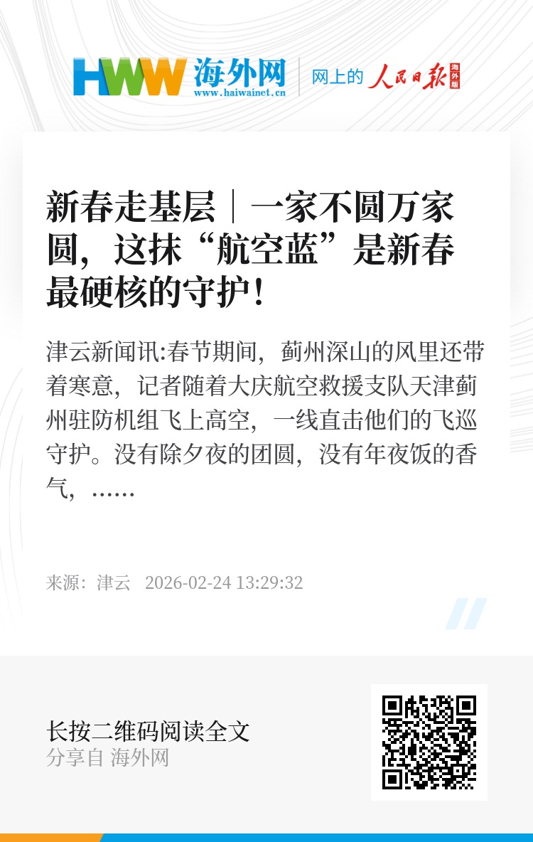 “一家不圆万家圆”“为人民守夜”,这是他们共同的声音。他们以长期驻防的责任担当、千锤百炼的实战本领,在津北青山间筑起坚不可摧的空中防火线,以坚守守护首都东部生态安全,为万家团圆保驾护航。这抹“航空蓝”,是这个新春最硬核的守护,也是云端之上最温暖的年味。