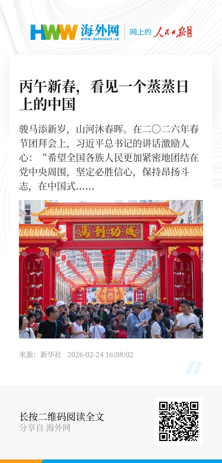 丙午新春,神州大地流光溢彩,涌动的人潮、火热的消费,生动诠释着国内大市场的强劲韧性;“中国红”点亮世界、免签政策联通中外,尽显大国开放的包容胸怀;无数奋斗者以只争朝夕的拼搏实干,为高质量发展积蓄磅礴动能……