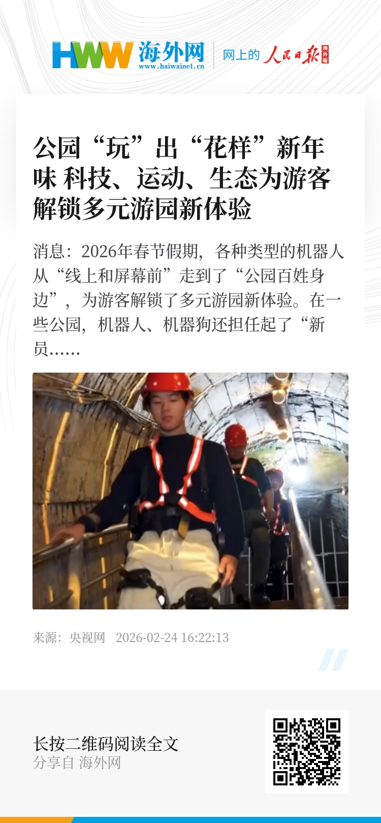 春节期间,湖北黄石国家矿山公园上新了智能外骨骼机器人和AI讲解员,让游客更轻松感受工业遗址的魅力。据了解,位于地下100多米的井下探幽项目,进出矿井要步行1400多级台阶。为此,景区为游客准备了智能外骨骼机器人,帮助他们轻松抵达地下矿井,体验井下寻宝的乐趣。与此同时,为了满足游客深度游的需求,景区还推出了AI讲解小程序,以便游客加深对矿冶文化的了解。
