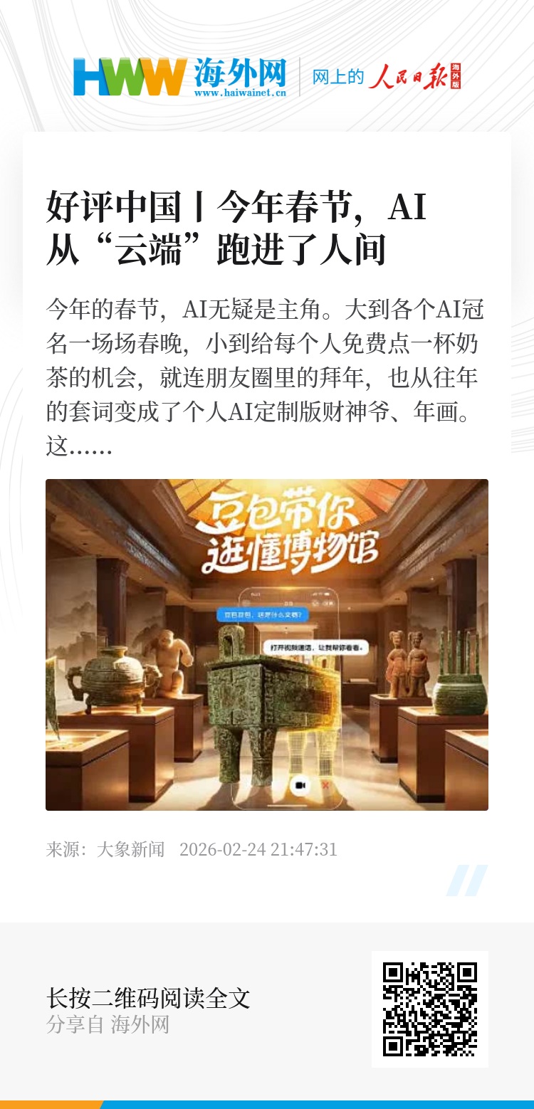 前几年我们聊AI,总离不开算力参数、大模型排行榜,仿佛那是只有专业领域人群才能“点评”一二的高档货。2026年的这个马年春节,我们看到了AI深度嵌入民生场景的新面貌。它干的事儿变了,在博物馆当讲解员,在庙会里藏黄金,帮大爷大妈点外卖,让小朋友把自己的脸合成到古代战马上。它不单单是用来“秀”,更多是用来“用”的。