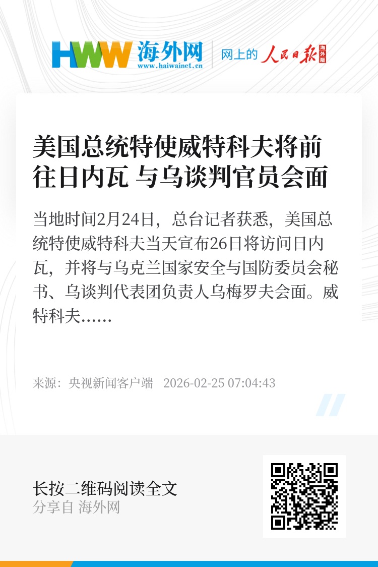 当地时间2月24日,总台记者获悉,美国总统特使威特科夫当天宣布26日将访问日内瓦,并将与乌克兰国家安全与国防委员会秘书、乌谈判代表团负责人乌梅罗夫会面。