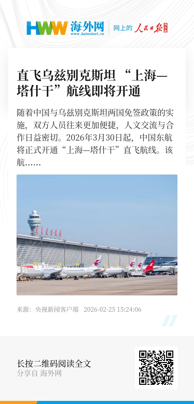 随着中国与乌兹别克斯坦两国免签政策的实施,双方人员往来更加便捷,人文交流与合作日益密切。2026年3月30日起,中国东航将正式开通“上海—塔什干”直飞航线。该航线是继2025年开通“西安—塔什干”航线后,进一步服务高质量共建“一带一路”、深化中国与中亚地区互联互通的又一重要举措,拓展了以上海为枢纽、面向中亚的“空中走廊”,为两地经贸合作、人文交往与旅游互动注入新动能。
