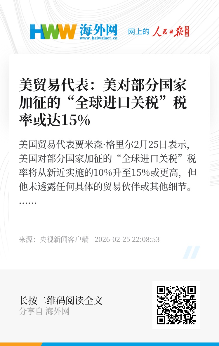裁决公布后,特朗普20日转而依据《1974年贸易法》第122条,宣布加征“全球进口关税”,税率10%,为期150天,以取代被最高法院认定违法的关税。随后在21日,美国总统特朗普又在其社交平台“真实社交”上发文称,将把对全球商品加征10%的进口关税的税率水平提高至15%。(央视记者 吴汉婴)
