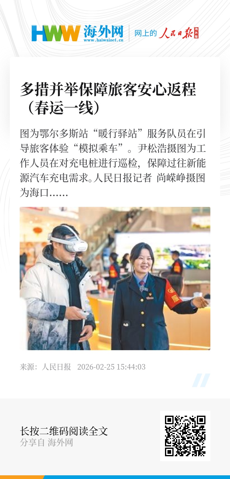 2026年春节假期,全社会跨区域人员流动量累计超28亿人次,创历史新高。随着春节假期结束,学子返校、务工返岗、旅游返家……亿万人带着暖意与期待,踏上了返程路。为了让旅客顺利抵达目的地,各相关部门协同发力,聚焦各方需求,全力护好返程路。人民日报记者深入一线,在机场、火车站、港口、高速公路收费站等交通场站,感受春运一线工作者的坚守与奉献,记录旅客们返程途中的新体验。