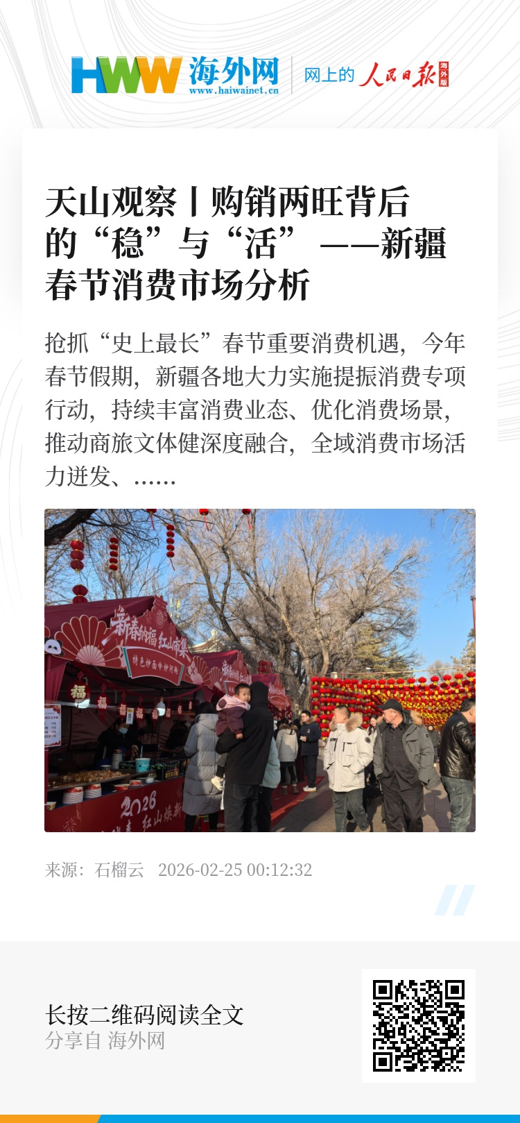 抢抓“史上最长”春节重要消费机遇,今年春节假期,新疆各地大力实施提振消费专项行动,持续丰富消费业态、优化消费场景,推动商旅文体健深度融合,全域消费市场活力迸发、热度攀升,商务部门重点监测的零售、餐饮企业销售额同比增长6.1%,呈现购销两旺、繁荣有序的良好态势。