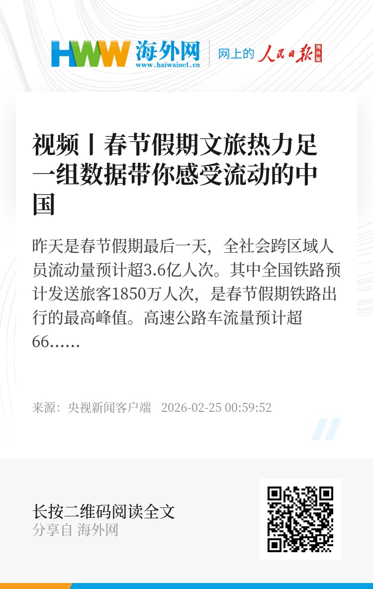 昨天是春节假期最后一天,全社会跨区域人员流动量预计超3.6亿人次。其中全国铁路预计发送旅客1850万人次,是春节假期铁路出行的最高峰值。高速公路车流量预计超6600万辆次,民航客运量预计265万人次。今年春节假期,各地文旅市场情况如何?一组数据带你感受流动的中国。