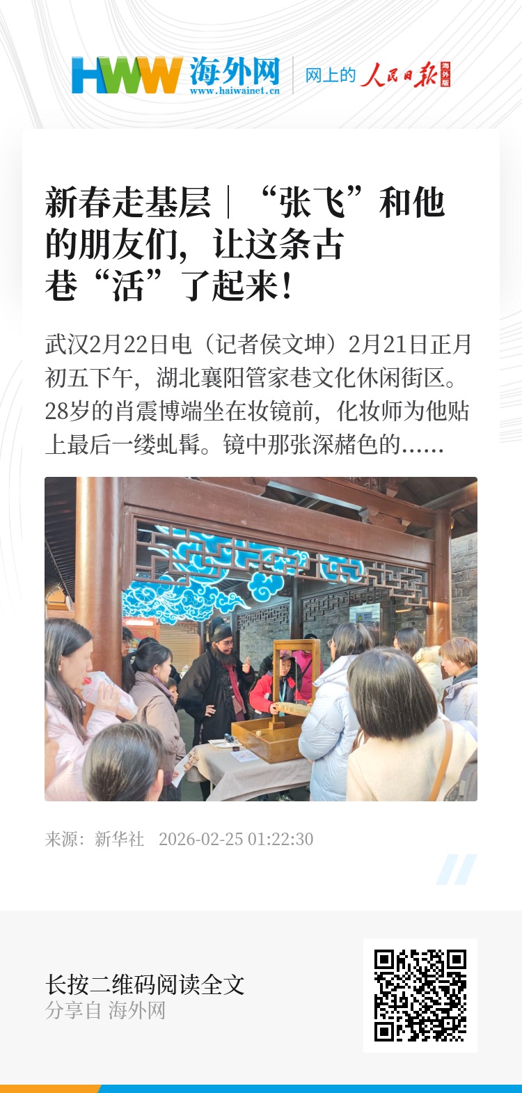 新华社武汉2月22日电(记者侯文坤)2月21日正月初五下午,湖北襄阳管家巷文化休闲街区。28岁的肖震博端坐在妆镜前,化妆师为他贴上最后一缕虬髯。镜中那张深赭色的脸,眉宇间仿佛聚起怒目之威。