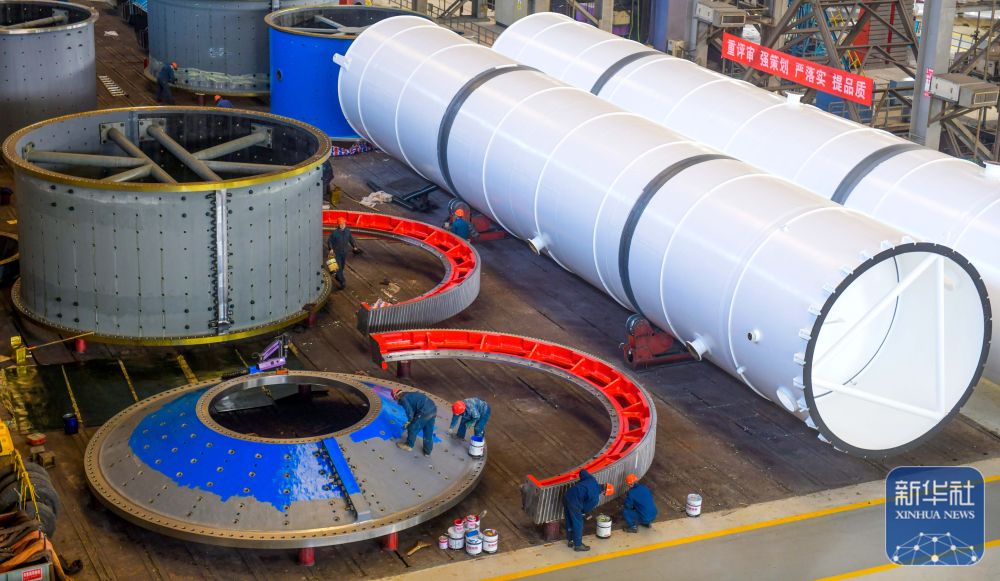 ↑ 2月24日,在江苏省连云港经济技术开发区重山风电设备公司车间,工人在生产风电塔架。新华社发(王健民摄)