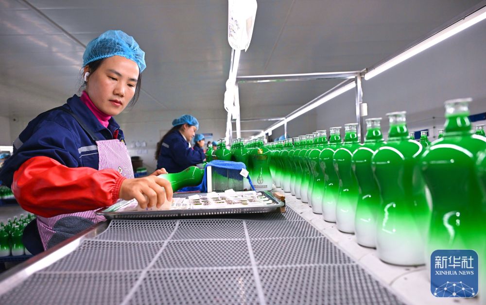 ↑ 2月24日,在位于四川省眉山市仁寿县汪洋镇的四川鑫盛昌水晶玻璃有限公司生产车间,工人在玻璃瓶上贴花。新华社发(潘建勇摄)