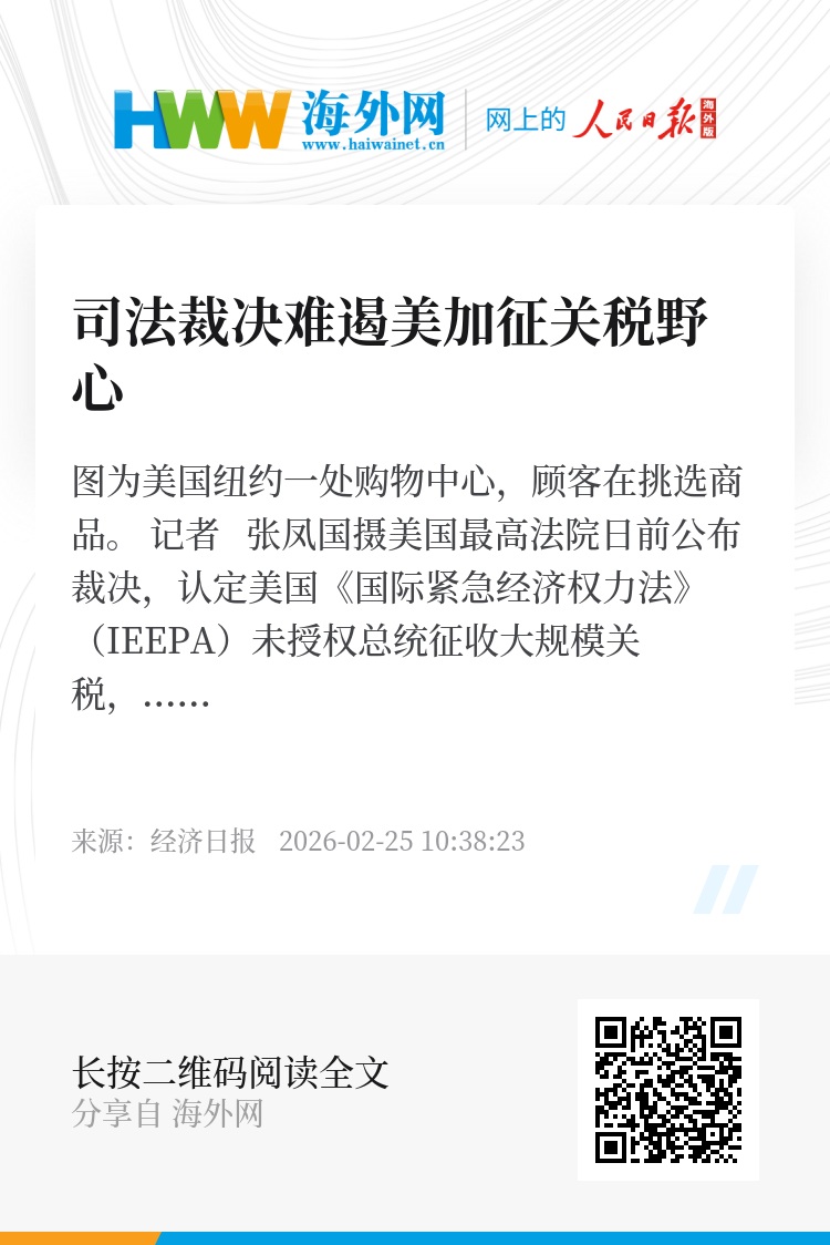 美国最高法院日前公布裁决,认定美国《国际紧急经济权力法》(IEEPA)未授权总统征收大规模关税,这标志着特朗普政府第二任期内以此为依据的加征关税举措遭遇重大法律挫折。然而,裁决并未动摇其整体政策方向,国际社会仍需警惕来自美国加征关税威胁的不确定性。
