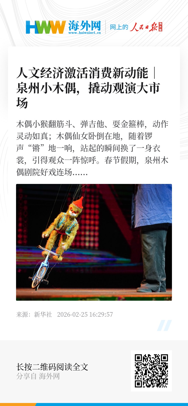 “泉州提线木偶戏的走红,既源于对千年传统的坚守,也得益于与时俱进的创新。守正创新、贴近市场、拥抱时代,小剧种也能拥有大舞台,老传统也能焕发新生机。”洪世键说。(记者庞梦霞)