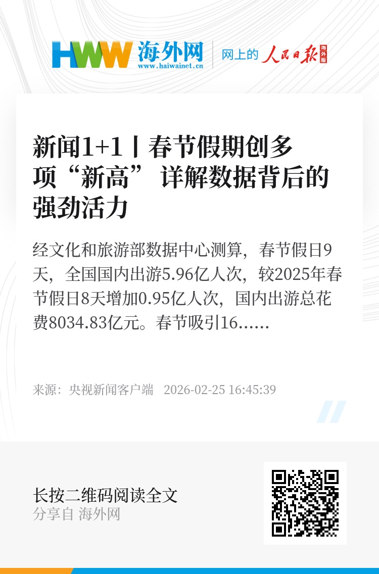 经文化和旅游部数据中心测算,春节假日9天,全国国内出游5.96亿人次,较2025年春节假日8天增加0.95亿人次,国内出游总花费8034.83亿元。春节吸引160多个国家和地区的游客,足迹覆盖国内300多个城市,较去年假期日均增长28.5%。《新闻1+1》关注:春节旅游,游什么?