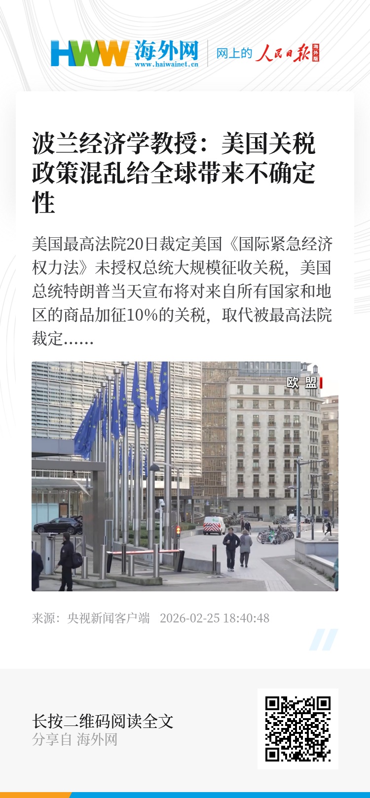 美国最高法院20日裁定美国《国际紧急经济权力法》未授权总统大规模征收关税,美国总统特朗普当天宣布将对来自所有国家和地区的商品加征10%的关税,取代被最高法院裁定违法的关税,21日又将这一税率提升至15%。