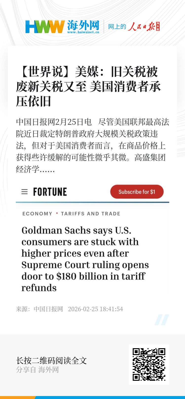 中国日报网2月25日电 尽管美国联邦最高法院近日裁定特朗普政府大规模关税政策违法,但对于美国消费者而言,在商品价格上获得些许缓解的可能性微乎其微。高盛集团经济学家警告称,与关税相关的通胀或已见顶,但短期内物价却不太可能出现实质性的回落。