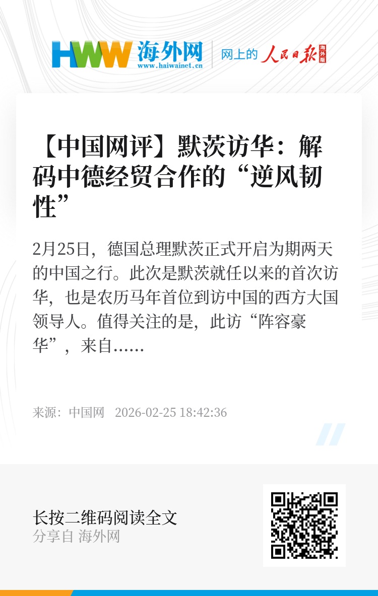 2月25日,德国总理默茨正式开启为期两天的中国之行。此次是默茨就任以来的首次访华,也是农历马年首位到访中国的西方大国领导人。值得关注的是,此访“阵容豪华”,来自拜耳制药、大众汽车、奔驰、宝马、西门子等德国顶尖企业的30余名商界领袖随行,凸显了默茨肩负的重大“商贸使命”。德国《明镜》周刊在访前评论称,“默茨从未如此精心准备过一次出访”。在这份精心准备的背后,既是默茨对扩大和深化中德合作的迫切期待,也是当前德国面临内忧外患的现实困境。