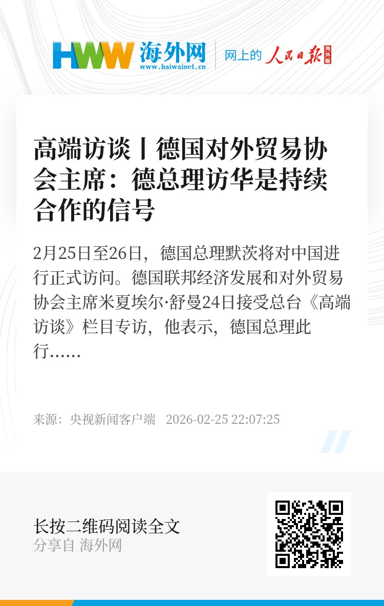 2月25日至26日,德国总理默茨将对中国进行正式访问。德国联邦经济发展和对外贸易协会主席米夏埃尔·舒曼24日接受总台《高端访谈》栏目专访,他表示,德国总理此行既是持续合作的信号,也是经济务实态度的体现。