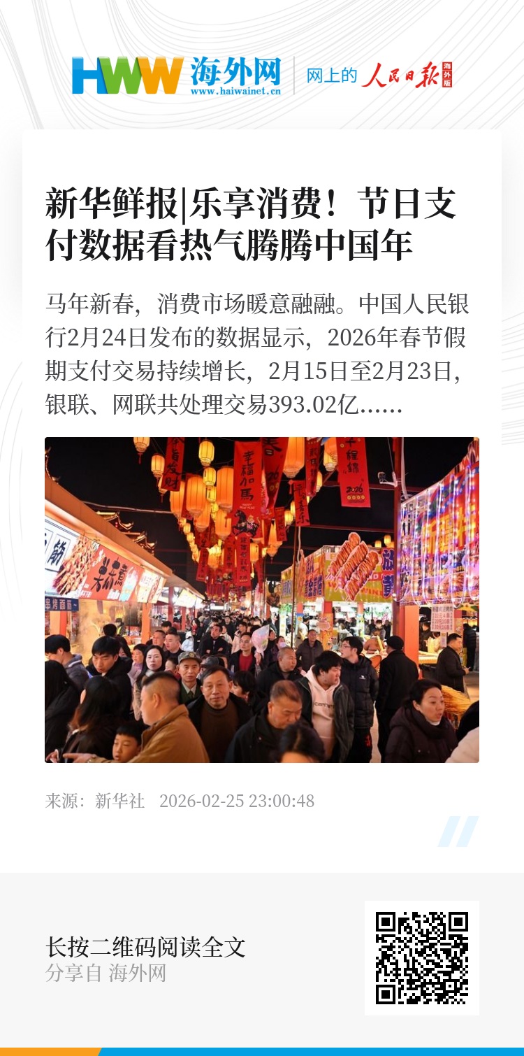 在这个最长春节假期里,海南离岛免税购物金额27.2亿元,较去年春节假期增长30.8%;微信支付旅行、生活娱乐类线下交易笔数同比涨幅均超20%;支付宝“AI付”用户数突破1亿,入境游客用支付宝消费金额比去年春节增长超80%……人潮涌动、消费活跃,生动诠释了中国市场的强劲韧性。