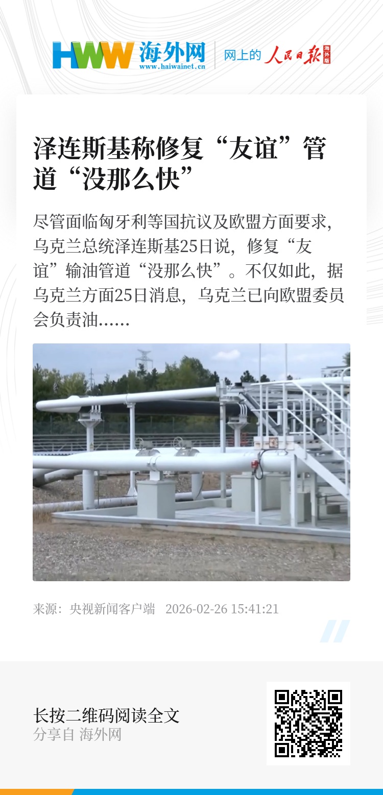 同在25日,斯洛伐克总理菲佐重申,现有信息显示“友谊”管道完全可恢复输油,但乌方给出的最新答复却是管道在3月3日前不会恢复运转。