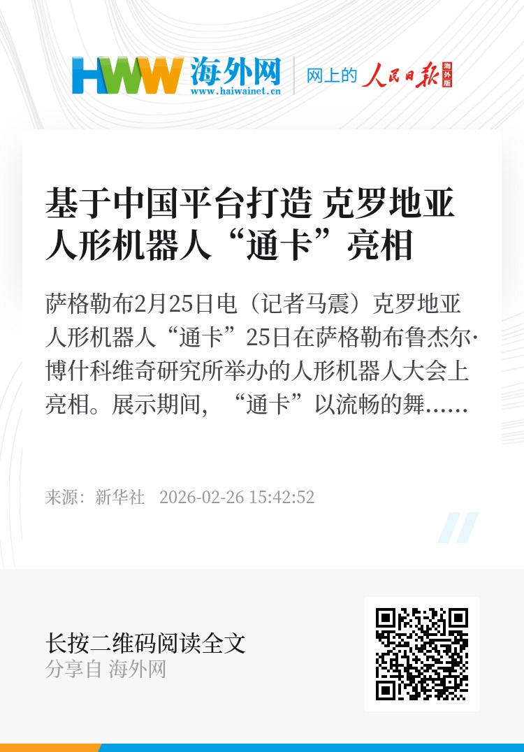 新华社萨格勒布2月25日电(记者马震)克罗地亚人形机器人“通卡”25日在萨格勒布鲁杰尔·博什科维奇研究所举办的人形机器人大会上亮相。展示期间,“通卡”以流畅的舞姿和功夫动作吸引了众多观众的目光。