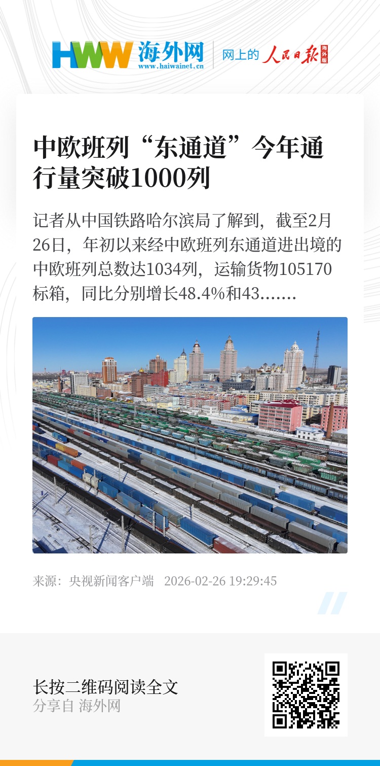 记者从中国铁路哈尔滨局了解到,截至2月26日,年初以来经中欧班列东通道进出境的中欧班列总数达1034列,运输货物105170标箱,同比分别增长48.4%和43.2%,较2025年提前26天突破1000列大关。