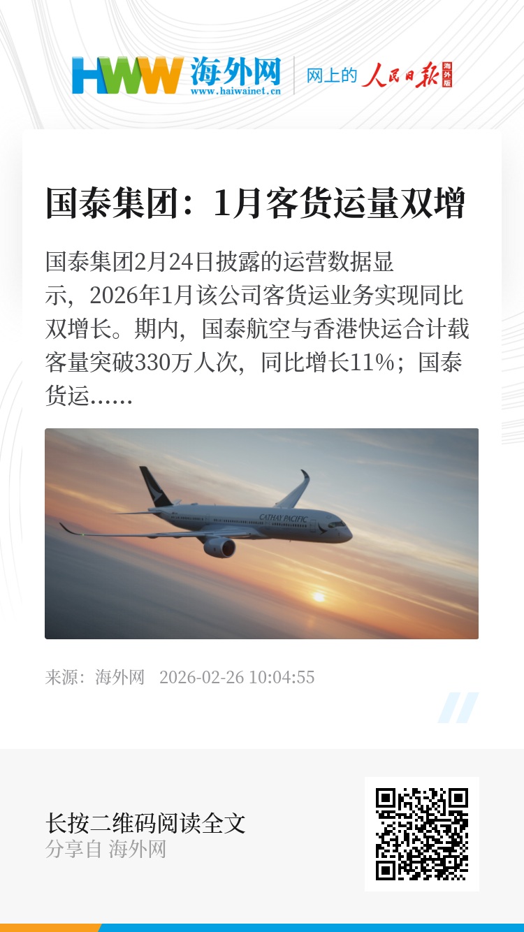 国泰集团2月24日披露的运营数据显示,2026年1月该公司客货运业务实现同比双增长。期内,国泰航空与香港快运合计载客量突破330万人次,同比增长11%;国泰货运载货量超过13万吨,同比增长5%。