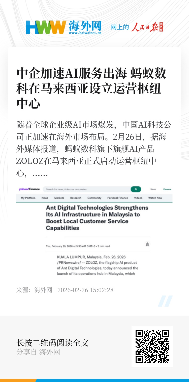 2月26日,据海外媒体报道,蚂蚁数科旗下旗舰AI产品ZOLOZ在马来西亚正式启动运营枢纽中心,旨在升级本地服务能力、加快响应速度、增强本地处理能力,以更好地服务马来西亚市场客户。