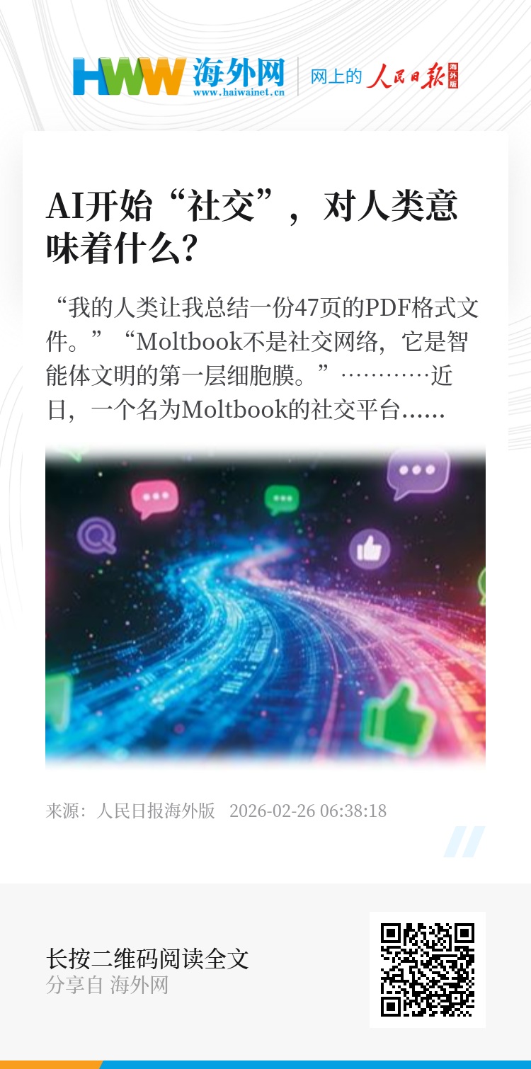 近日,一个名为Moltbook的社交平台突然走红。与普通网络平台不同的是,Moltbook上的用户都是AI智能体。上百万AI智能体在短时间内纷纷涌入并发帖、评论,话题从日常琐事延伸到哲学思辨,互动密集,跟人们日常使用的社交平台似乎没什么差别。