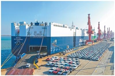 江苏连云港,滚装船正在装运出口新能源汽车等。