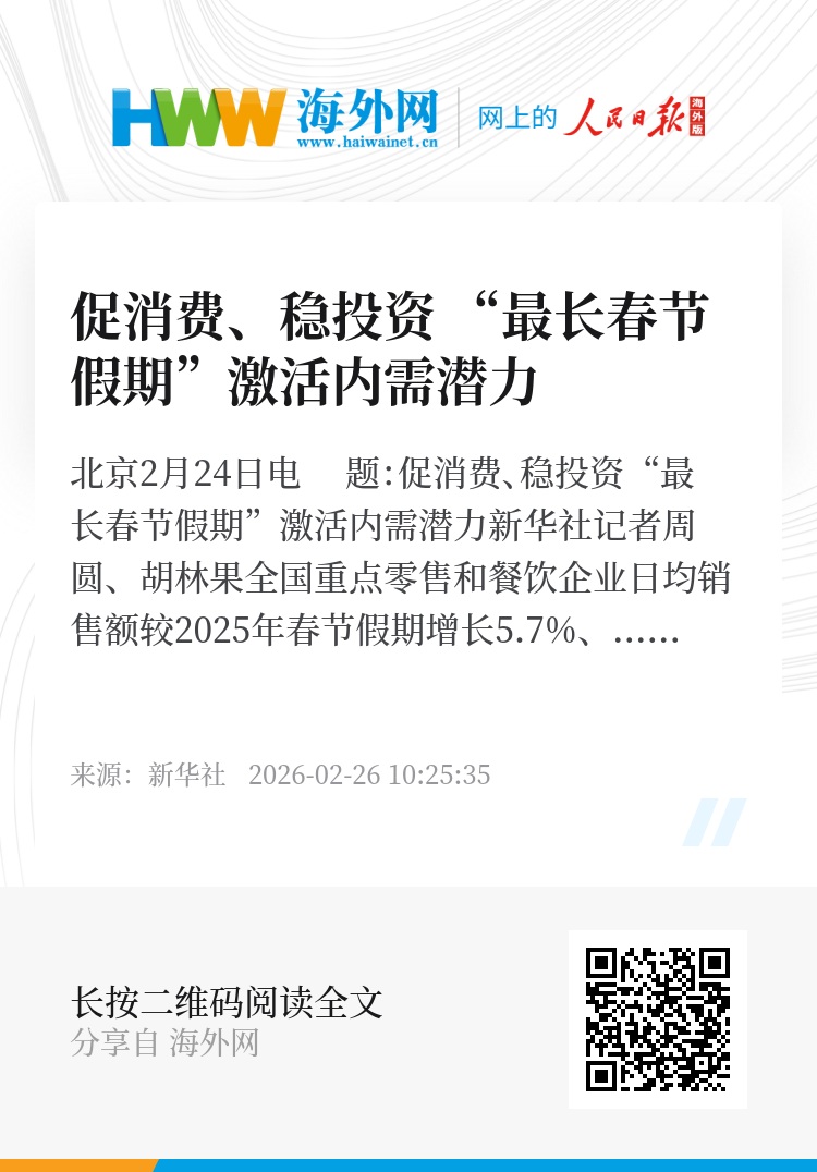 “坚持内需主导,建设强大国内市场”被中央经济工作会议列为2026年经济工作重点任务之首。春节假期的新气象,是经济活力的直观体现,也展示出内需潜力正有效释放。