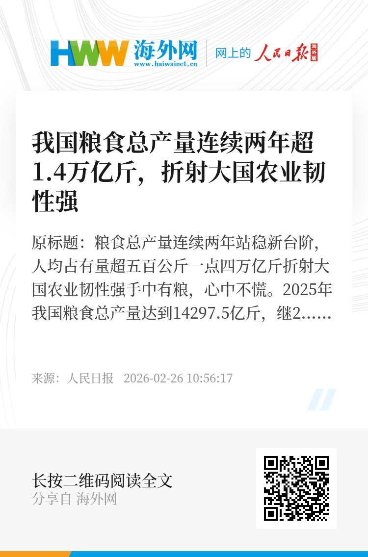 手中有粮,心中不慌。2025年我国粮食总产量达到14297.5亿斤,继2024年首次突破1.4万亿斤后,连续两年站稳这一新台阶。