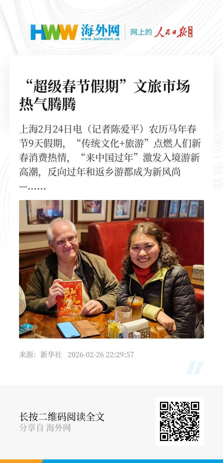 新华社上海2月24日电(记者陈爱平)农历马年春节9天假期,“传统文化+旅游”点燃人们新春消费热情,“来中国过年”激发入境游新高潮,反向过年和返乡游都成为新风尚——这个“超级春节假期”,我国文旅市场热气腾腾!