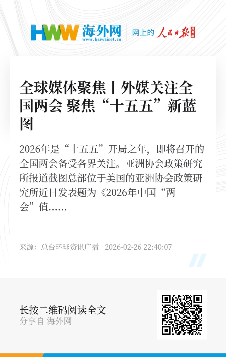 总部位于美国的亚洲协会政策研究所近日发表题为《2026年中国“两会”值得关注的内容》的文章。报道称,中国“两会”即将召开。来自全国各地的数千名代表将齐聚北京,参加中国政治日历上最重要的活动之一。今年尤为重要,因为政府不仅将宣布年度经济目标,全国人代会将审查“十五五”规划纲要草案,概述2026-2030年的政策目标。