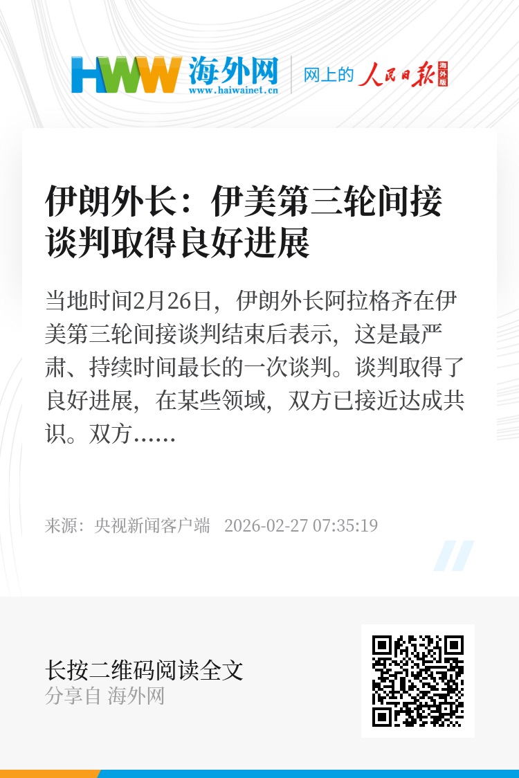 当地时间2月26日,伊朗外长阿拉格齐在伊美第三轮间接谈判结束后表示,这是最严肃、持续时间最长的一次谈判。谈判取得了良好进展,在某些领域,双方已接近达成共识。双方的技术团队将于下周一(3月2日)在奥地利维也纳举行技术谈判。