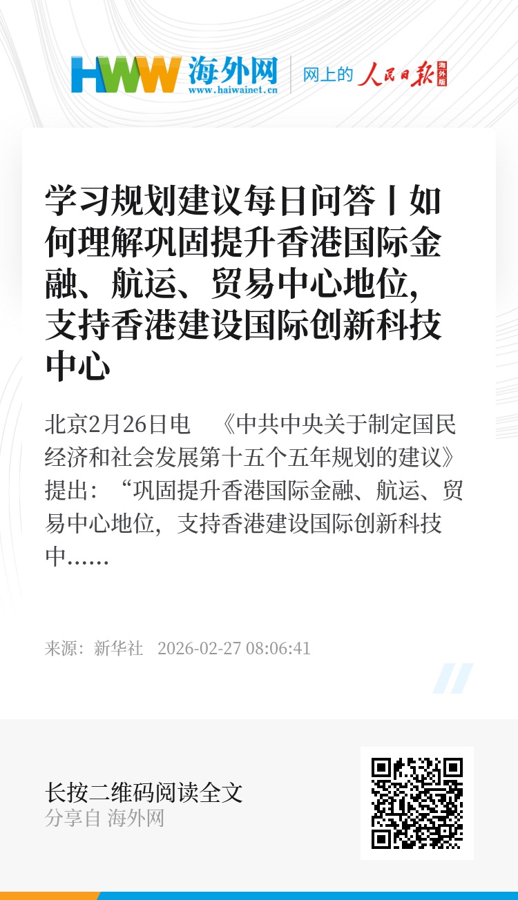 新华社北京2月26日电 《中共中央关于制定国民经济和社会发展第十五个五年规划的建议》提出:“巩固提升香港国际金融、航运、贸易中心地位,支持香港建设国际创新科技中心”。这是贯彻落实党的二十大精神,推动“十五五”时期香港经济社会不断发展的重要举措。