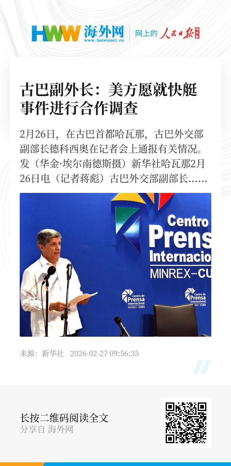 新华社哈瓦那2月26日电(记者蒋彪)古巴外交部副部长德科西奥26日在一场记者会上表示,古巴方面就前一天发生的美籍快艇闯入古巴领海并开火事件与美国国务院、美国海岸警卫队等机构保持沟通,美方已表示愿意配合以共同查明事件真相。