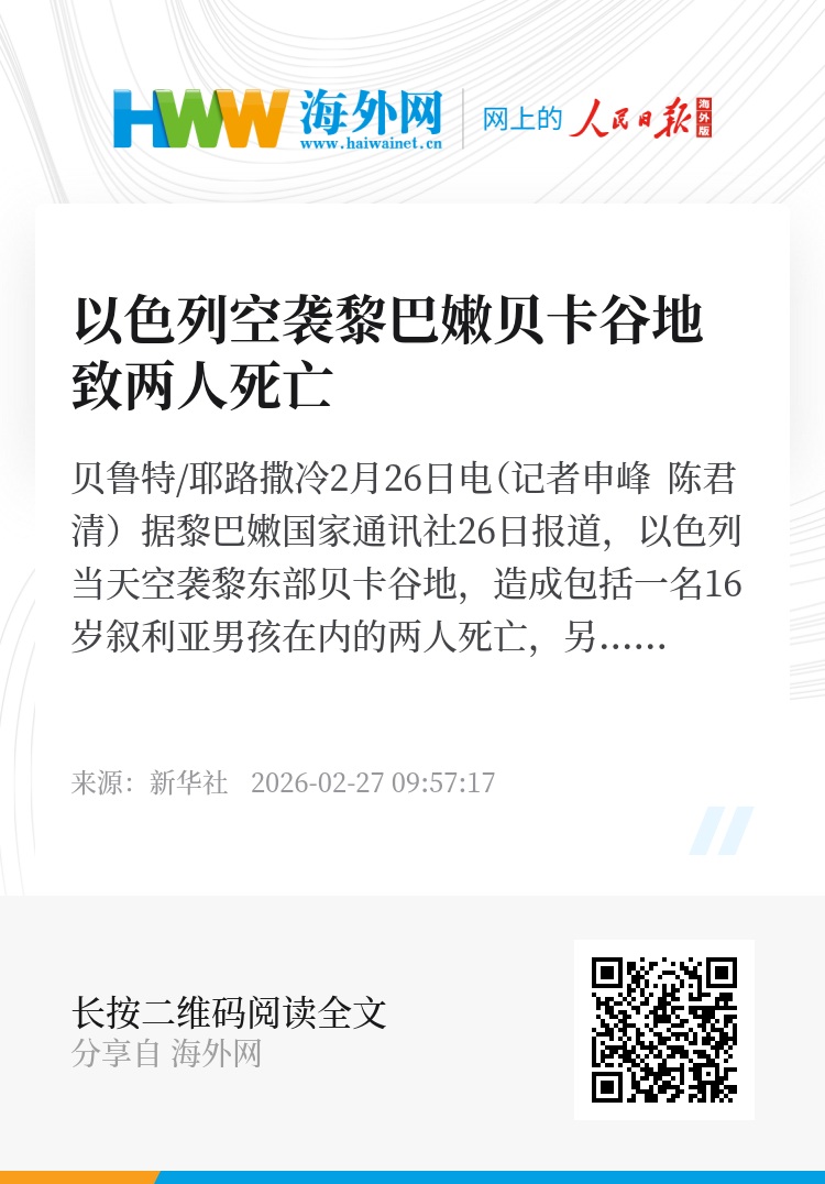 新华社贝鲁特/耶路撒冷2月26日电(记者申峰 陈君清)据黎巴嫩国家通讯社26日报道,以色列当天空袭黎东部贝卡谷地,造成包括一名16岁叙利亚男孩在内的两人死亡,另有18人受伤。