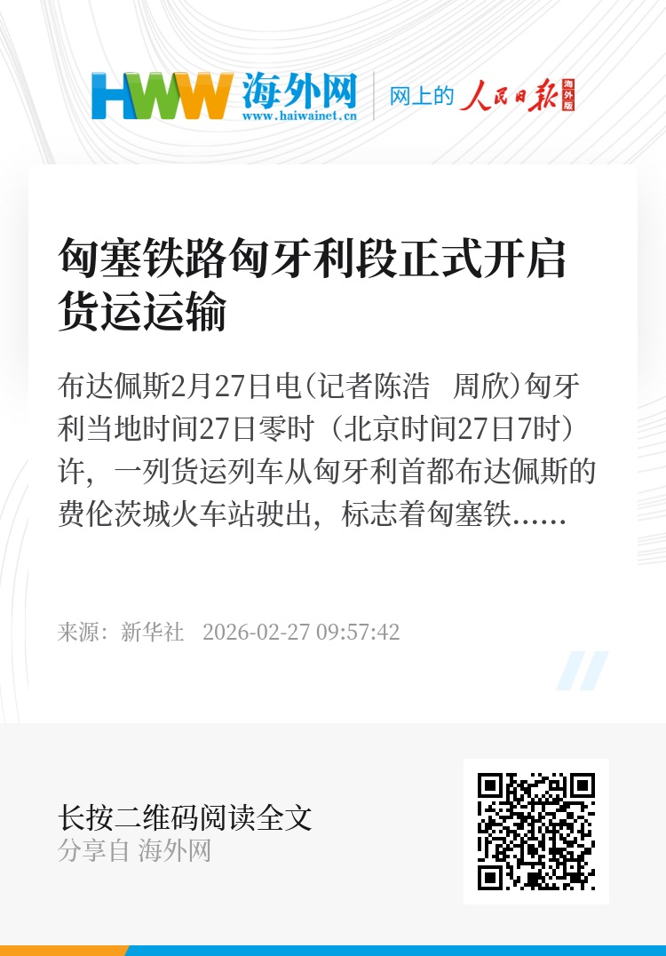 新华社布达佩斯2月27日电(记者陈浩 周欣)匈牙利当地时间27日零时(北京时间27日7时)许,一列货运列车从匈牙利首都布达佩斯的费伦茨城火车站驶出,标志着匈塞铁路匈牙利段正式开启货运运输。