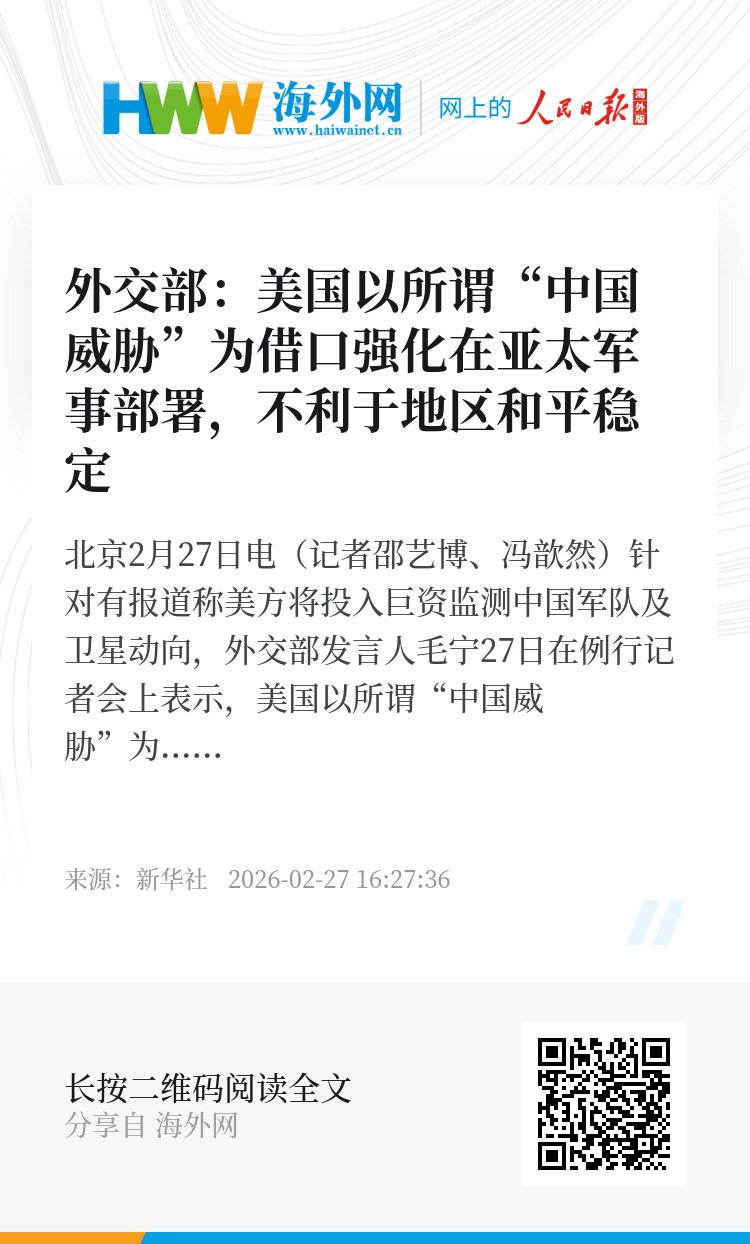 新华社北京2月27日电(记者邵艺博、冯歆然)针对有报道称美方将投入巨资监测中国军队及卫星动向,外交部发言人毛宁27日在例行记者会上表示,美国以所谓“中国威胁”为借口强化在亚太军事部署,不利于地区和平稳定,不符合地区国家利益。
