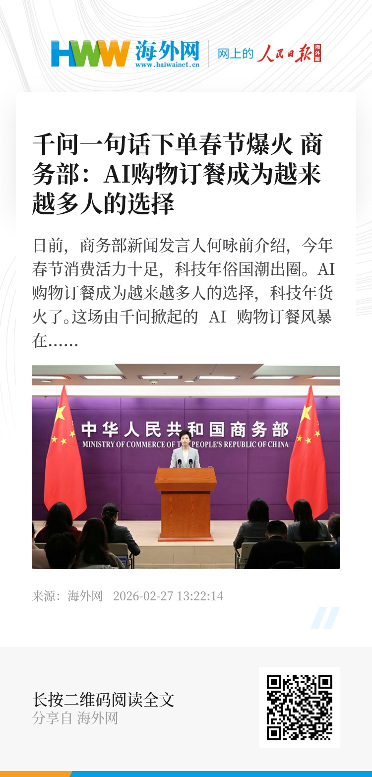 日前,商务部新闻发言人何咏前介绍,今年春节消费活力十足,科技年俗国潮出圈。AI购物订餐成为越来越多人的选择,科技年货火了。