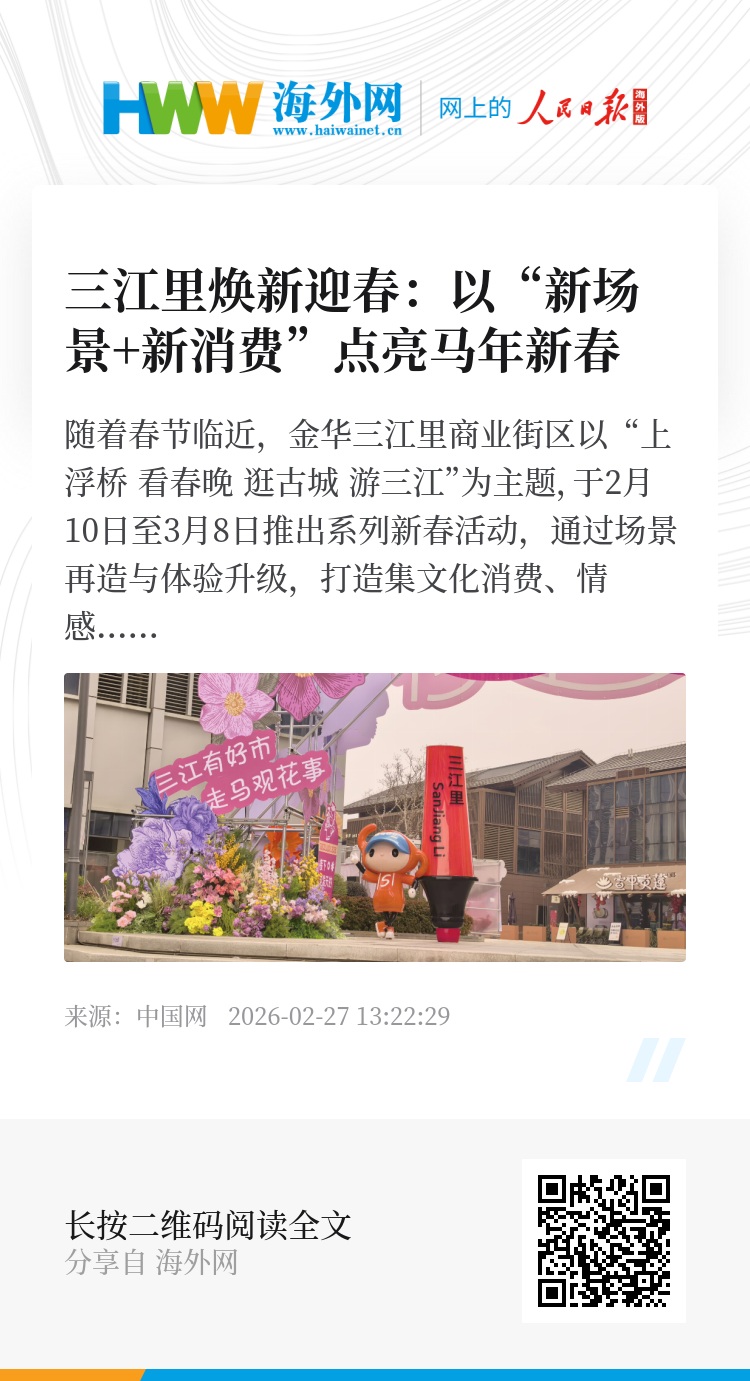随着春节临近,金华三江里商业街区以“上浮桥 看春晚 逛古城 游三江”为主题,于2月10日至3月8日推出系列新春活动,通过场景再造与体验升级,打造集文化消费、情感互动与城市公共生活于一体的新春新地标。