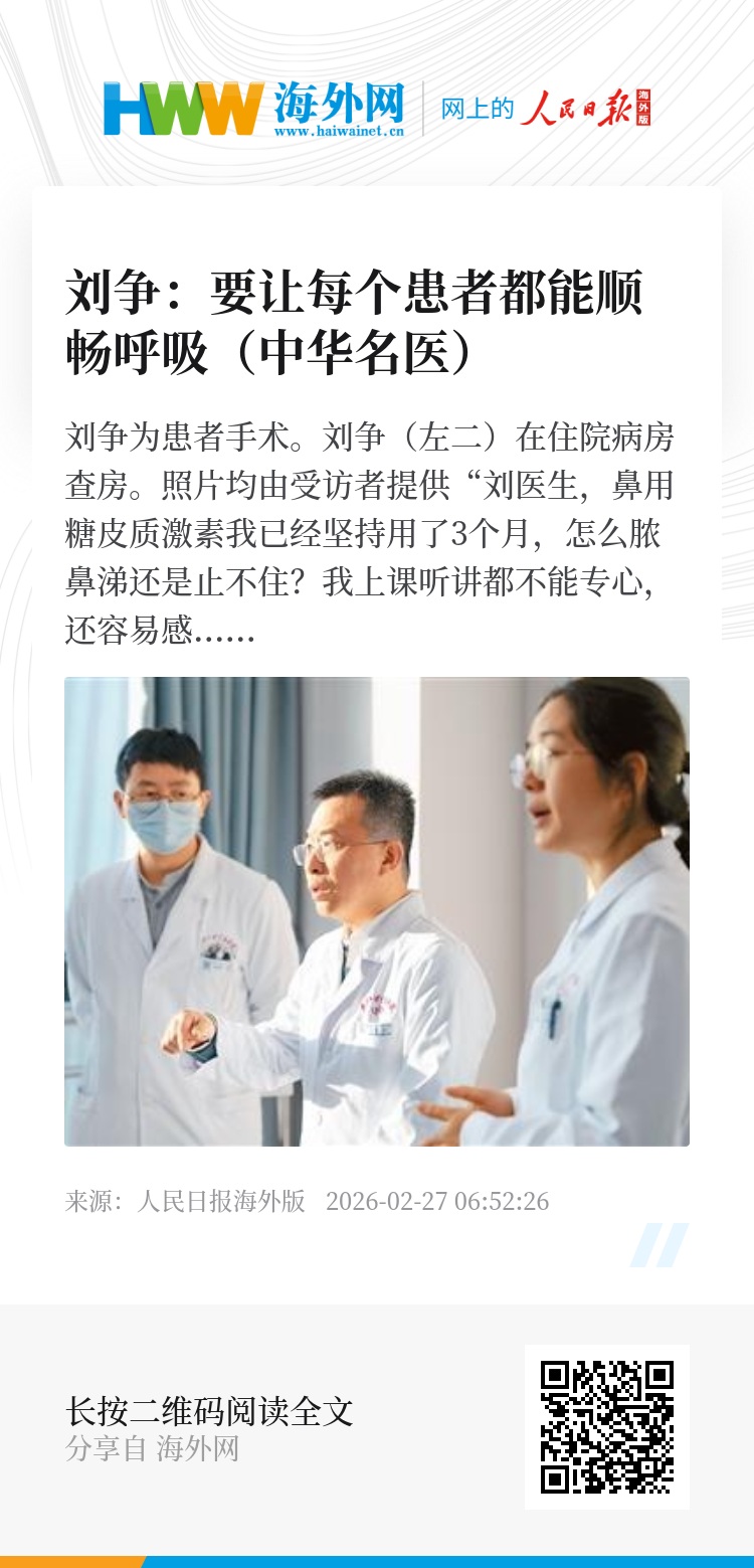 去年底,刘争凭借慢性鼻窦炎精准诊疗“中国方案”,荣获2025年度吴阶平医药创新奖。“能获得以我国医学界泰斗名字命名的奖项,是一份沉甸甸的荣誉,更是一种鞭策与激励。”刘争说,“目前我们只取得了阶段性成果,能缓解患者症状,但尚未彻底治愈该病。希望未来我国能自主发现全新靶点,并在此基础上研发出全新药物,提高中国患者用药针对性。”