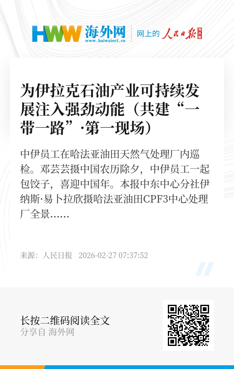 从教育卫生到民生保障,再到道路桥梁建设,15年来,哈法亚公司启动了一系列惠及民生的基础设施建设项目,累计完成公益项目数十个,惠及居民约10万人次,2025年获得伊拉克米桑省政府颁发的社区杰出贡献奖。伊拉克中国友好协会主席海德尔·鲁拜伊表示:“伊中能源合作是高质量共建‘一带一路’框架下具有战略意义的合作,中方项目对伊拉克经济发展和民生改善作出了显著贡献。”(本报记者 张志文)